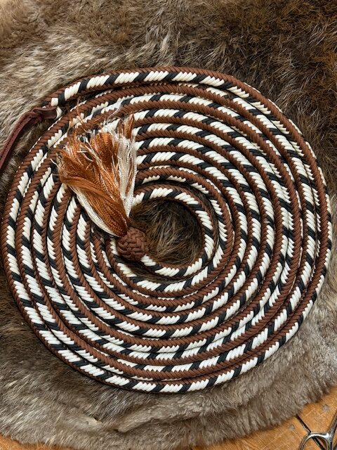 This beautiful Mecate is 22 feet 12 strands.Diameter is around 5/8″ – 3/4″ . Hand braided by Jolly.