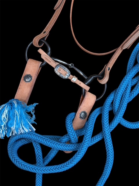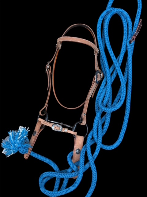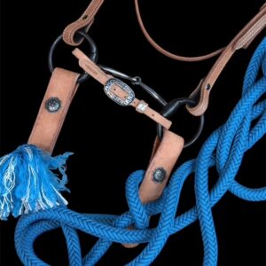 This set comes with curb strap, JWP Snaffle bit blued, 22 feet 12 strands Mecate and JWP hardware.
